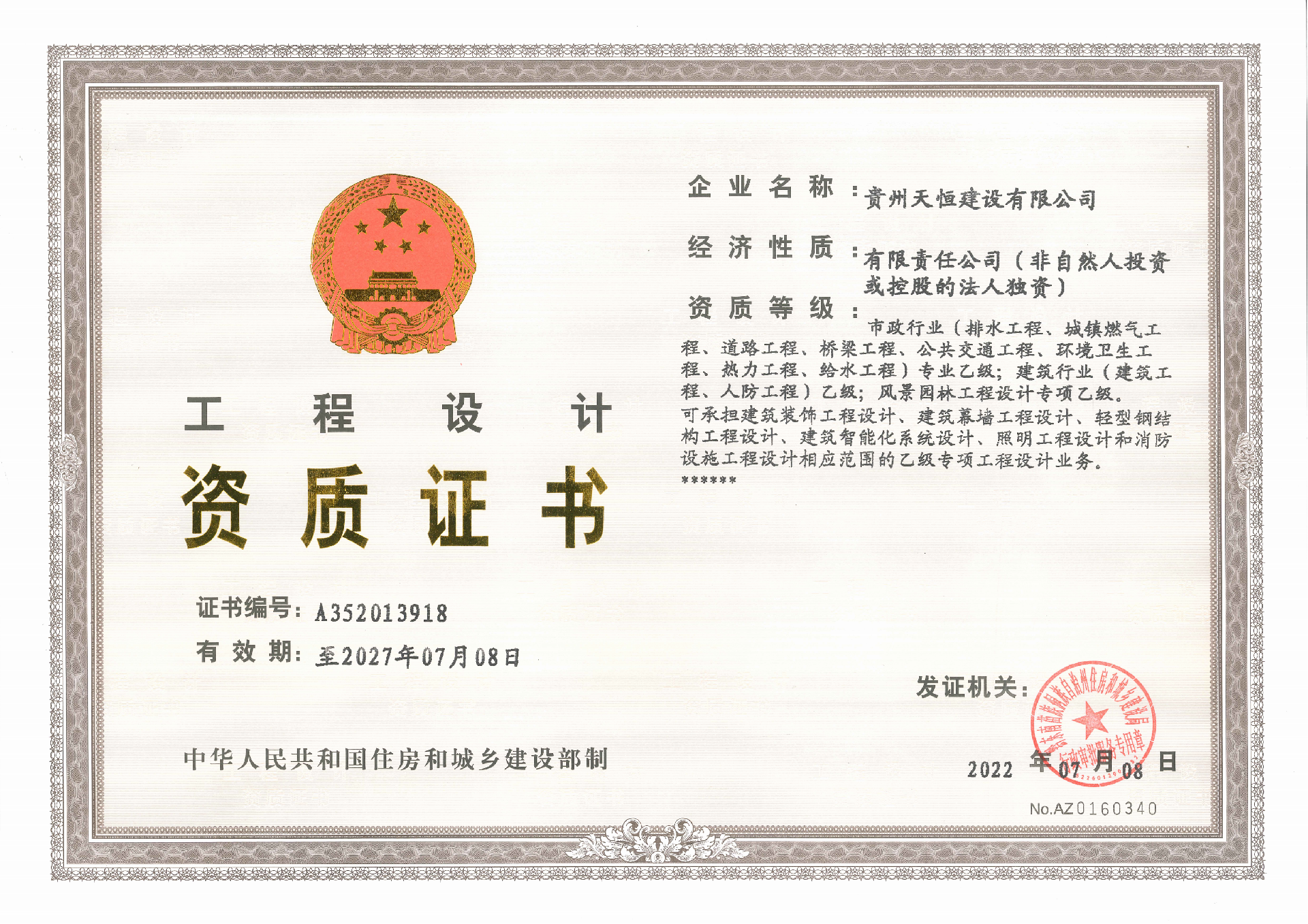 貴州天恒建設(shè)有限公司資質(zhì)范圍及等級: